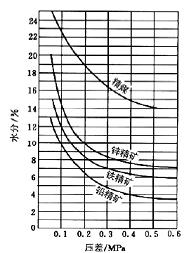 要現在過濾機工作的情況下改善過濾效果,更有效的方法就是提高過濾壓差,壓差對不同物料濾餅水分的影響如圖3所示。但要把真空狀態下使用的盤式過濾機改為正壓狀態下過濾,并應用到工業生產中卻難度很大,主要體現在兩個方面:其一是由于過濾壓差增大,過濾速度加快,對于過濾機的結構和性能提出一些要求;其二是在壓力密封條件下,要將濾餅順利排出且阻止壓氣逸出,也對加壓過濾技術提出更高的要求。